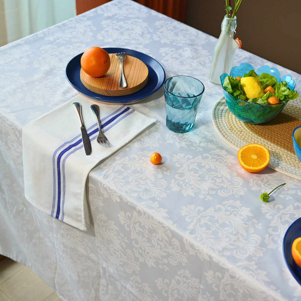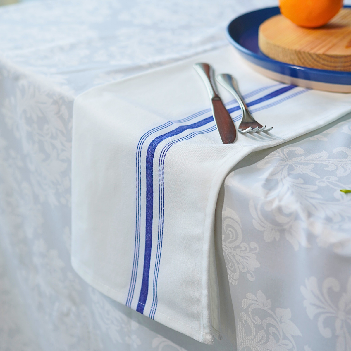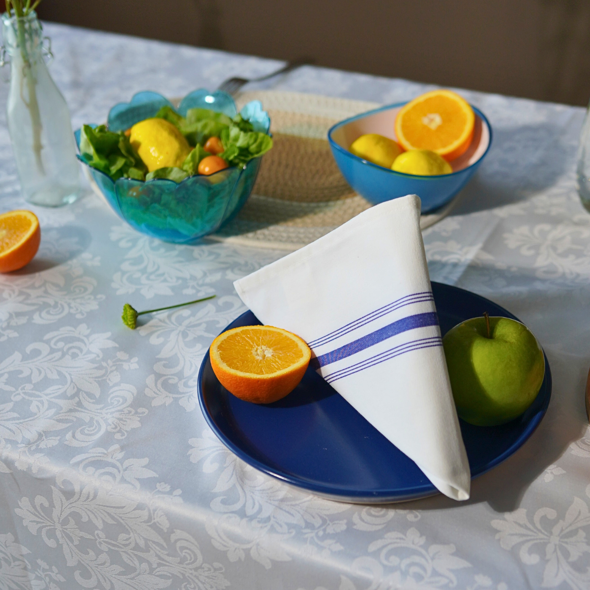 Decora tu mesa con elegancia y estilo en cualquier ocasión. Nuestras servilletas están confeccionadas con un diseño que resalta la sofisticación, un delicado estampado de rayas azules delgadas en el cabezal, que aporta un toque clásico y distintivo a tu mesa.