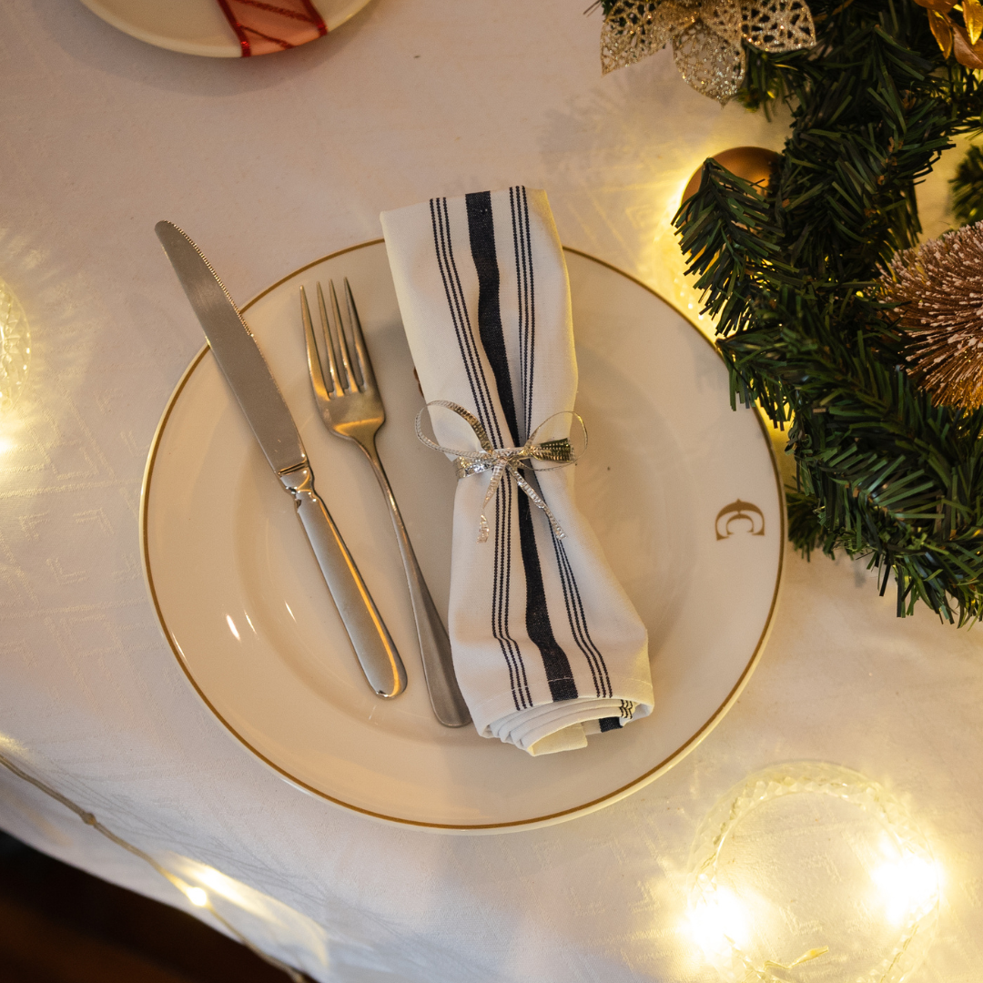 Decora tu mesa con elegancia y estilo en cualquier ocasión. Nuestras servilletas están confeccionadas con un diseño que resalta la sofisticación, un delicado estampado de rayas azules delgadas en el cabezal, que aporta un toque clásico y distintivo a tu mesa.